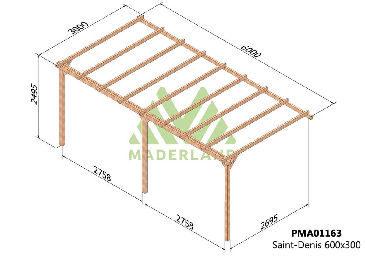 La quantité de poteaux, de poutres et de traverses peut varier en fonction des dimensions choisies, cette pergola a 3 poteaux, 4 poutres porteuses, 2 poutres de mur et 9 traverses.