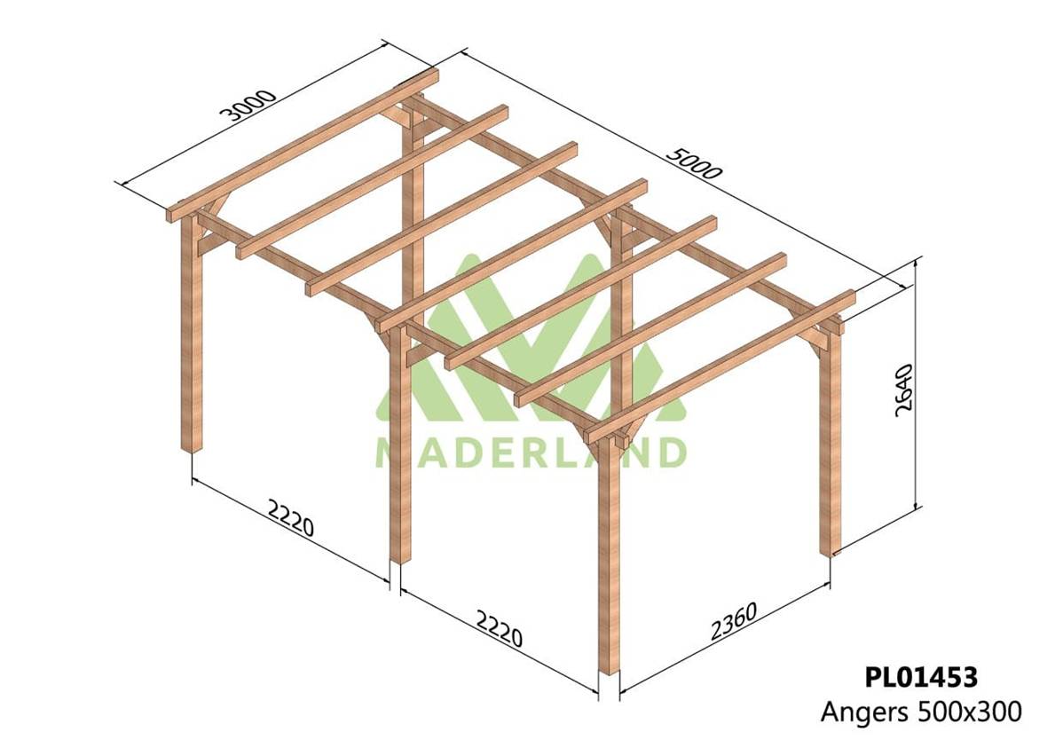 La quantité de poteaux, de poutres et de traverses peut varier en fonction des dimensions choisies, cette pergola a 6 poteaux, 4 poutres et 7 traverses.