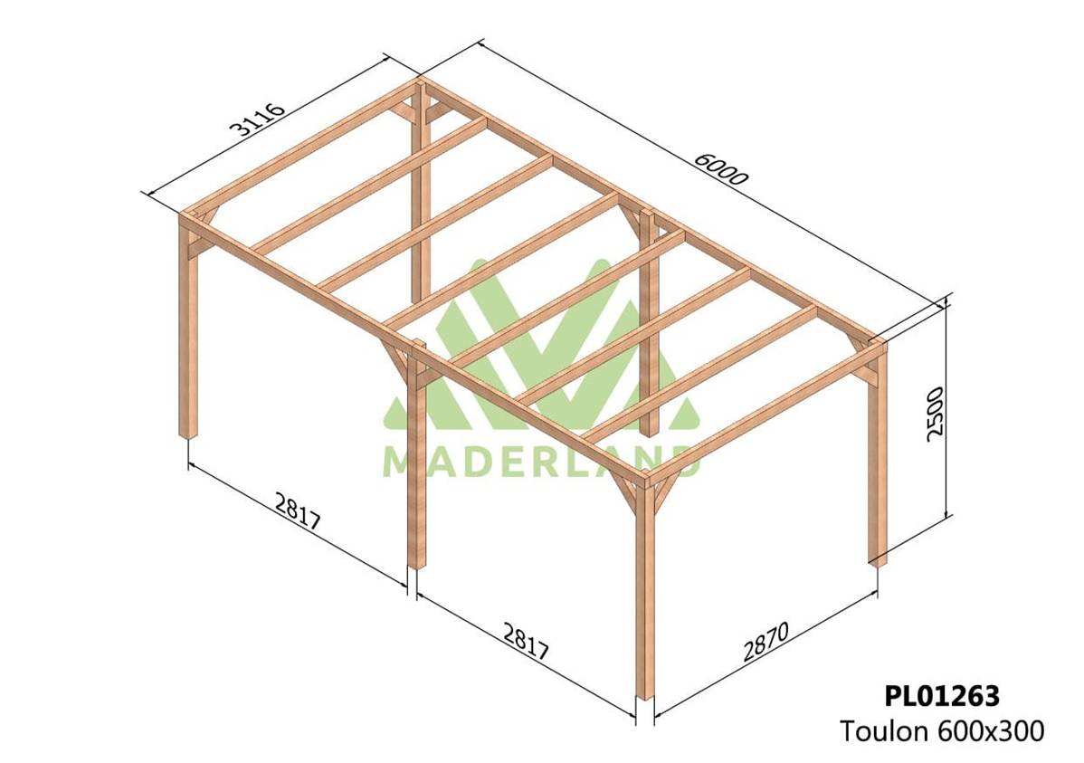 La quantité de poteaux, de poutres et de traverses peut varier en fonction des dimensions choisies, cette pergola a 6 poteaux, 4 poutres et 8 traverses.