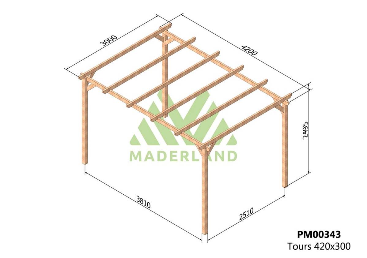 La quantité de poteaux, de poutres et de traverses peut varier en fonction des dimensions choisies, cette pergola a 4 poteaux, 2 poutres et 6 traverses.