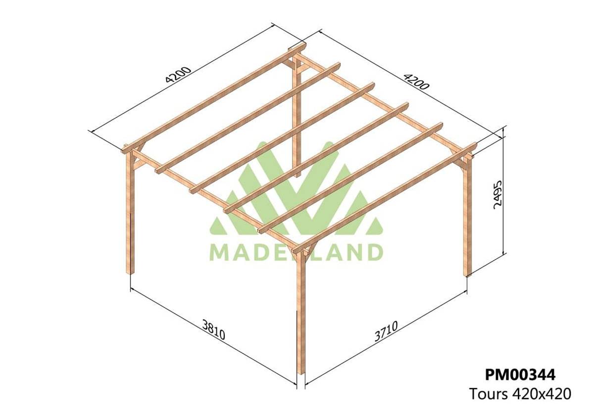 La quantité de poteaux, de poutres et de traverses peut varier en fonction des dimensions choisies, cette pergola a 4 poteaux, 2 poutres et 6 traverses.