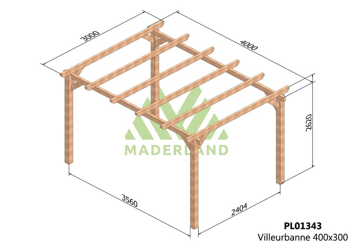 La quantité de poteaux, de poutres et de traverses peut varier en fonction des dimensions choisies, cette pergola a 4 poteaux, 2 poutres et 6 traverses.